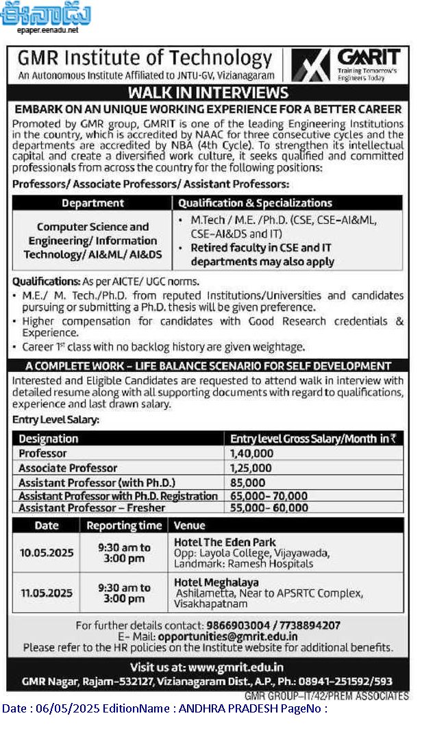 If you are interested, please send in your resumes at opportunities@gmrit.edu.in